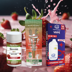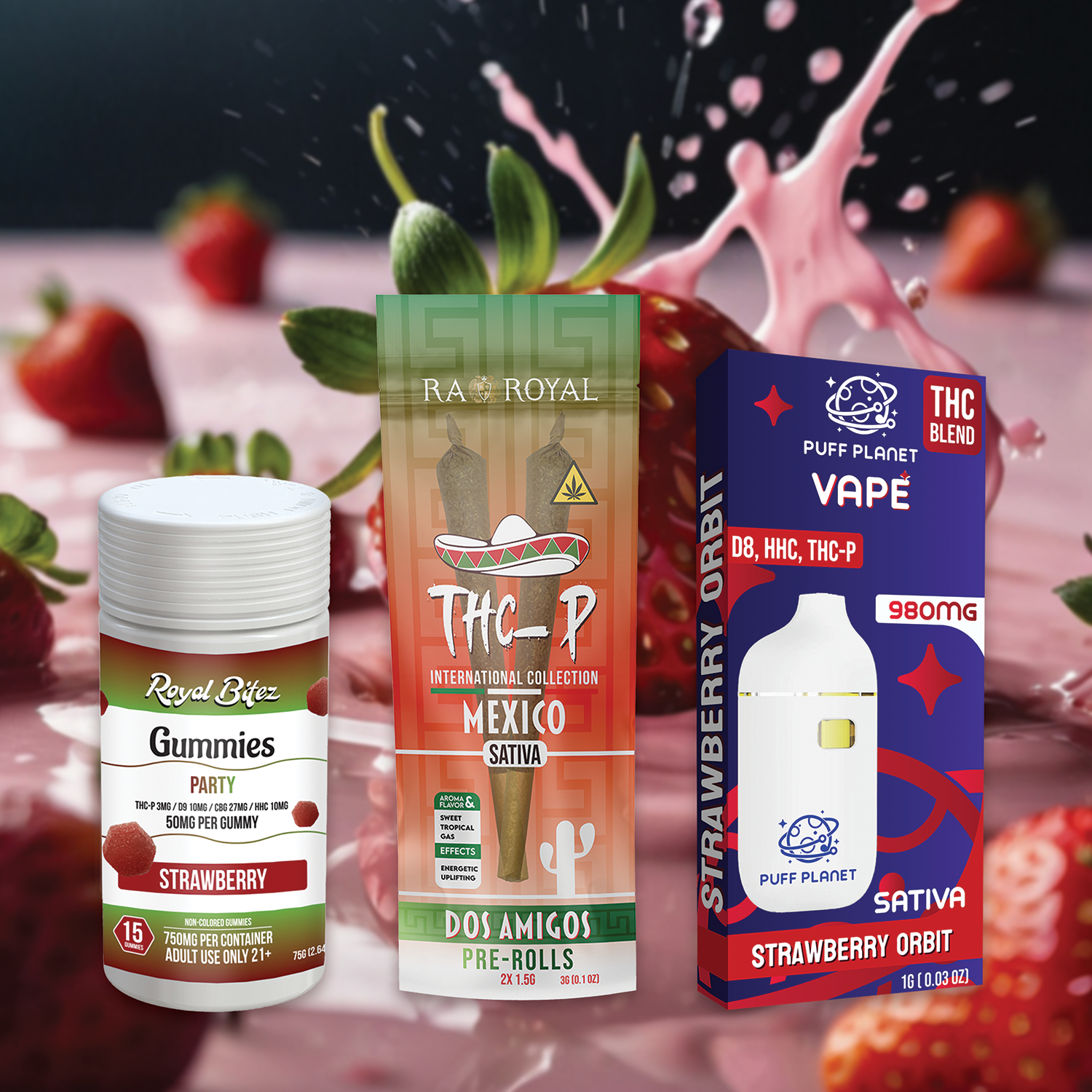 The Royal Bitez Party Strawberry Gummies pack serious strength into every bite, combining multiple cannabinoid blends for a flavorful, extra-strength experience. The Puff Planet Strawberry Orbit Vape offers smooth, portable draws with a potent blend designed for anytime enjoyment. Completing the trio, RA Royal International Dos Amigos Pre-Rolls deliver a ready-to-light smoke featuring infused flower and terpene-rich flavor.