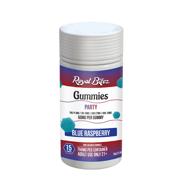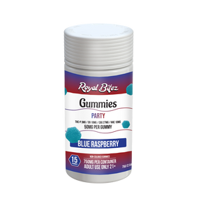 Royal Bitez Blue Raspberry Party Gummies are crafted with a fun and uplifting cannabinoid blend designed for social enjoyment and energy. Each gummy contains THCP, Delta-9 THC, CBG, and HHC for a balanced, potent experience, finished with a sweet blue raspberry flavor.