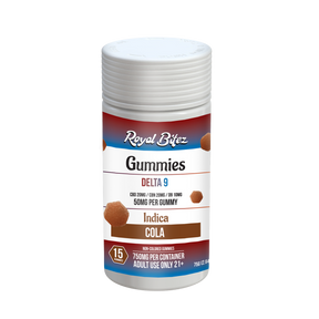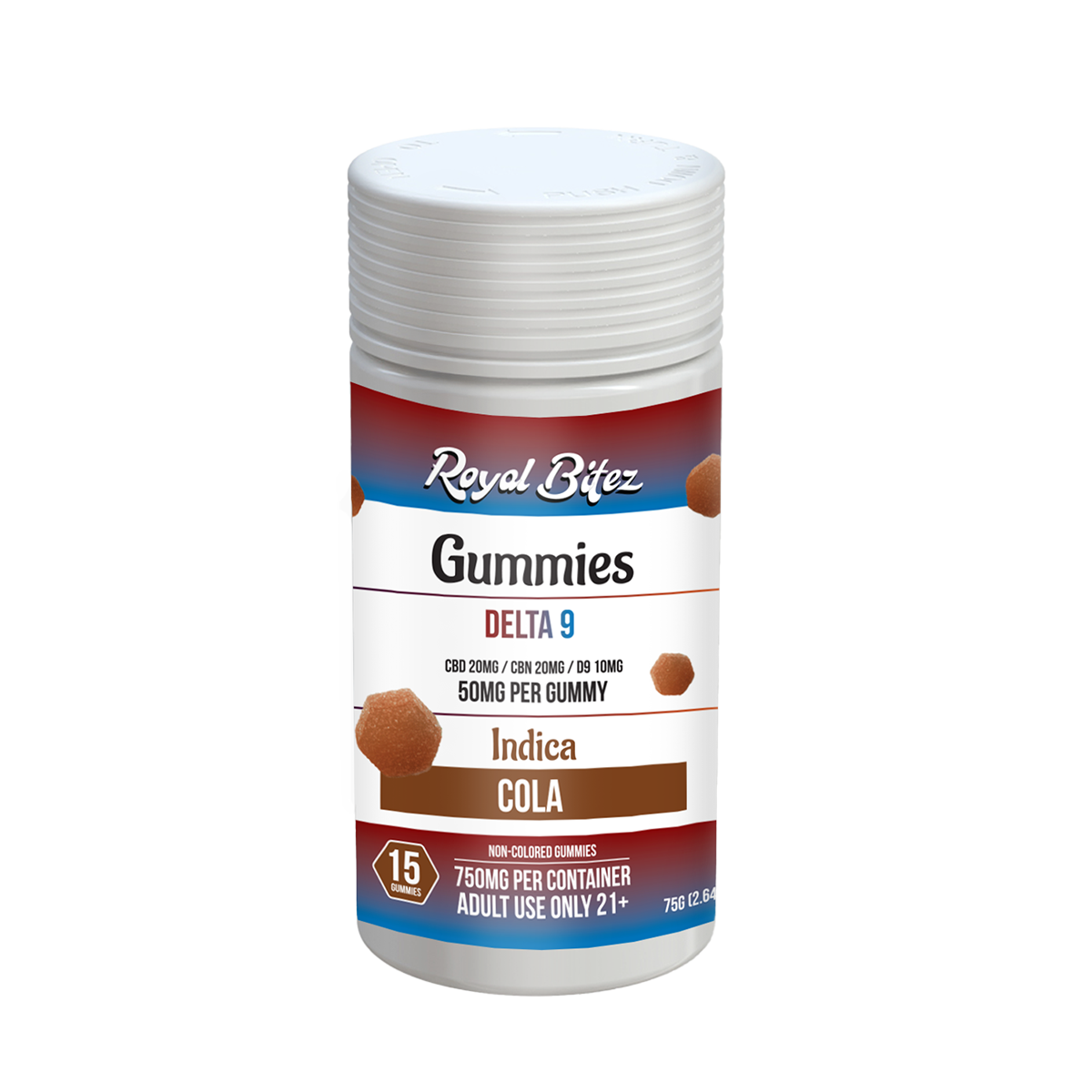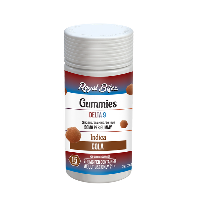 Royal Bitez Cola Delta-9 Gummies feature an indica-specific cannabinoid blend designed for relaxation and winding down. Each gummy combines hemp-derived Delta-9 THC with full spectrum CBD and CBN, delivering a smooth, calming experience with a classic cola flavor.