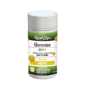 Royal Bitez Pineapple Delta-9 Gummies are crafted with a hybrid-specific cannabinoid blend designed for a balanced, versatile experience. Each gummy combines hemp-derived Delta-9 THC with full spectrum CBD, CBG, and CBN for smooth, all-day effects, finished with a tropical pineapple flavor.