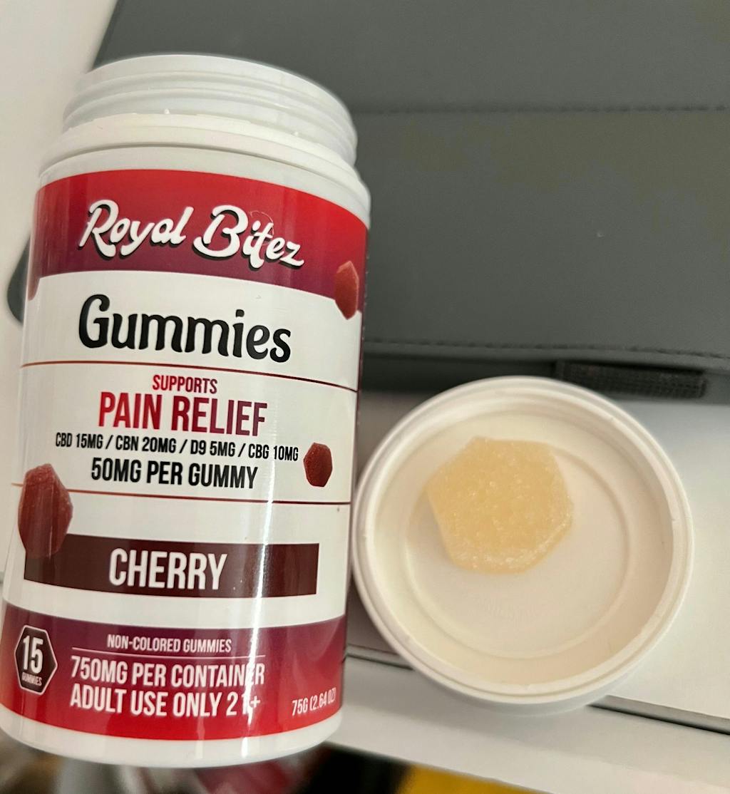 Royal Bitez Cherry Pain Relief Support Gummies are crafted with a targeted cannabinoid blend designed to support comfort and wellness. Each gummy combines full spectrum CBD, CBN, Delta-9 THC, and CBG for a smooth, effective experience, finished with a sweet cherry flavor.