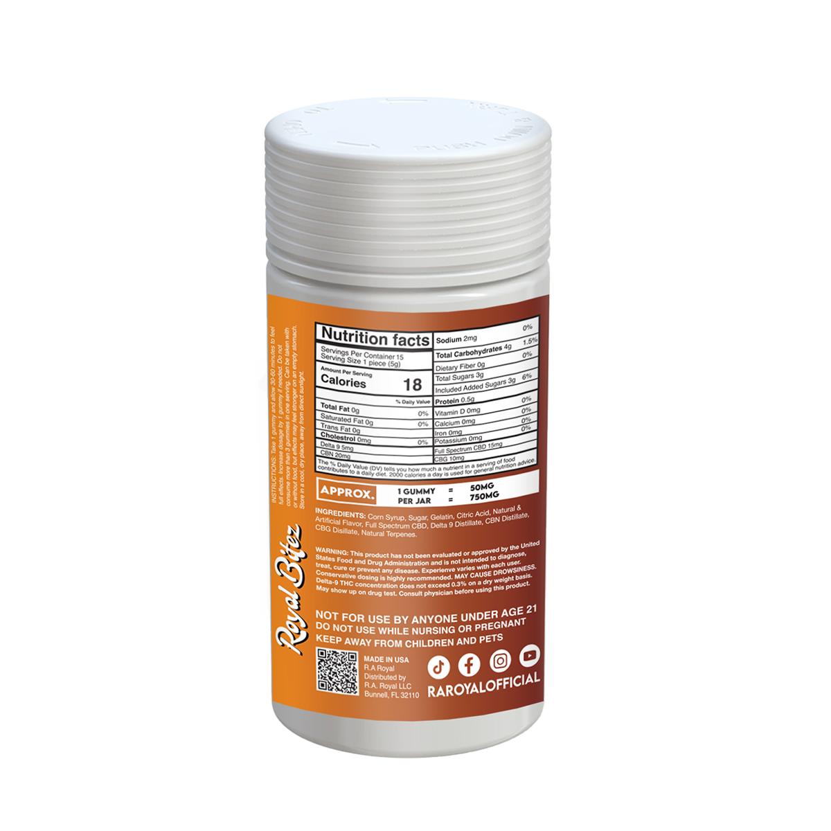 Royal Bitez Cola Pain Relief Support Gummies are crafted with a targeted cannabinoid blend designed to support comfort and wellness. Each gummy combines full spectrum CBD, CBN, Delta-9 THC, and CBG for a smooth, effective experience, finished with a classic cola flavor.