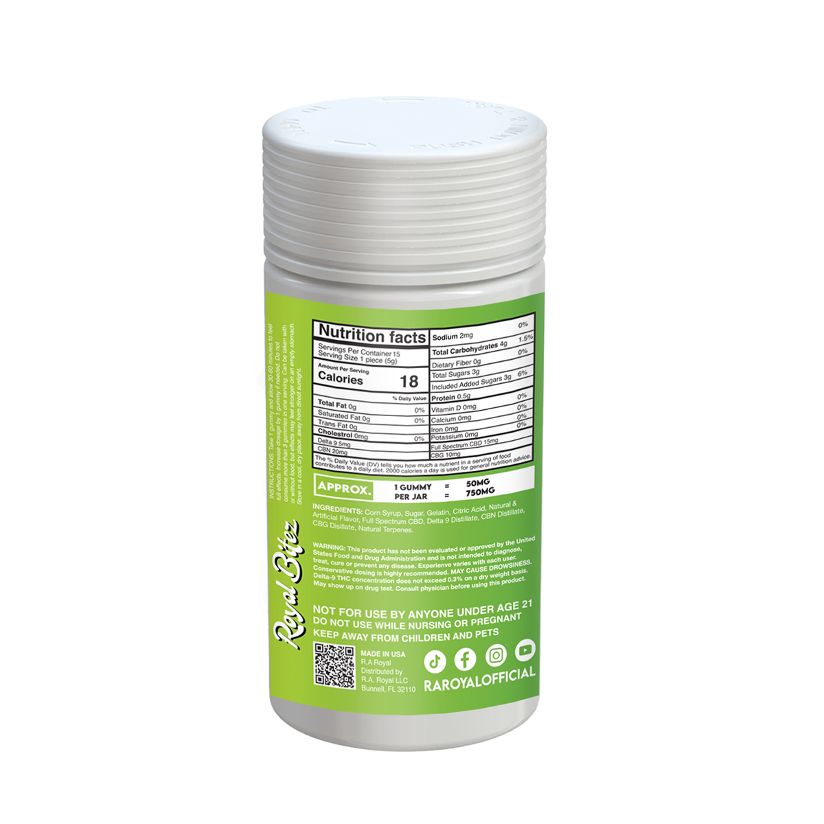 Royal Bitez Green Apple Pain Relief Support Gummies are crafted with a targeted cannabinoid blend designed to support comfort and wellness. Each gummy combines full spectrum CBD, CBN, Delta-9 THC, and CBG for a smooth, effective experience, finished with a crisp green apple flavor.