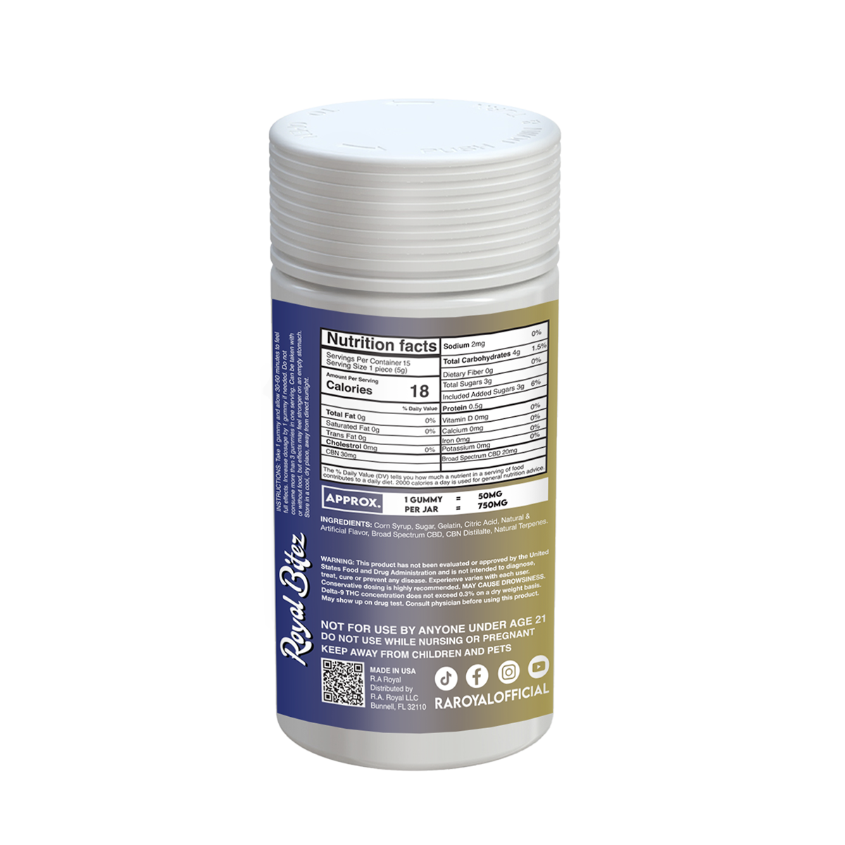 Royal Bitez Relax Fruit Punch Gummies are formulated to support calm, relaxation, and unwinding anytime you need it. Each gummy features a soothing blend of broad spectrum CBD and CBN, paired with a bold fruit punch flavor for a smooth, enjoyable experience.