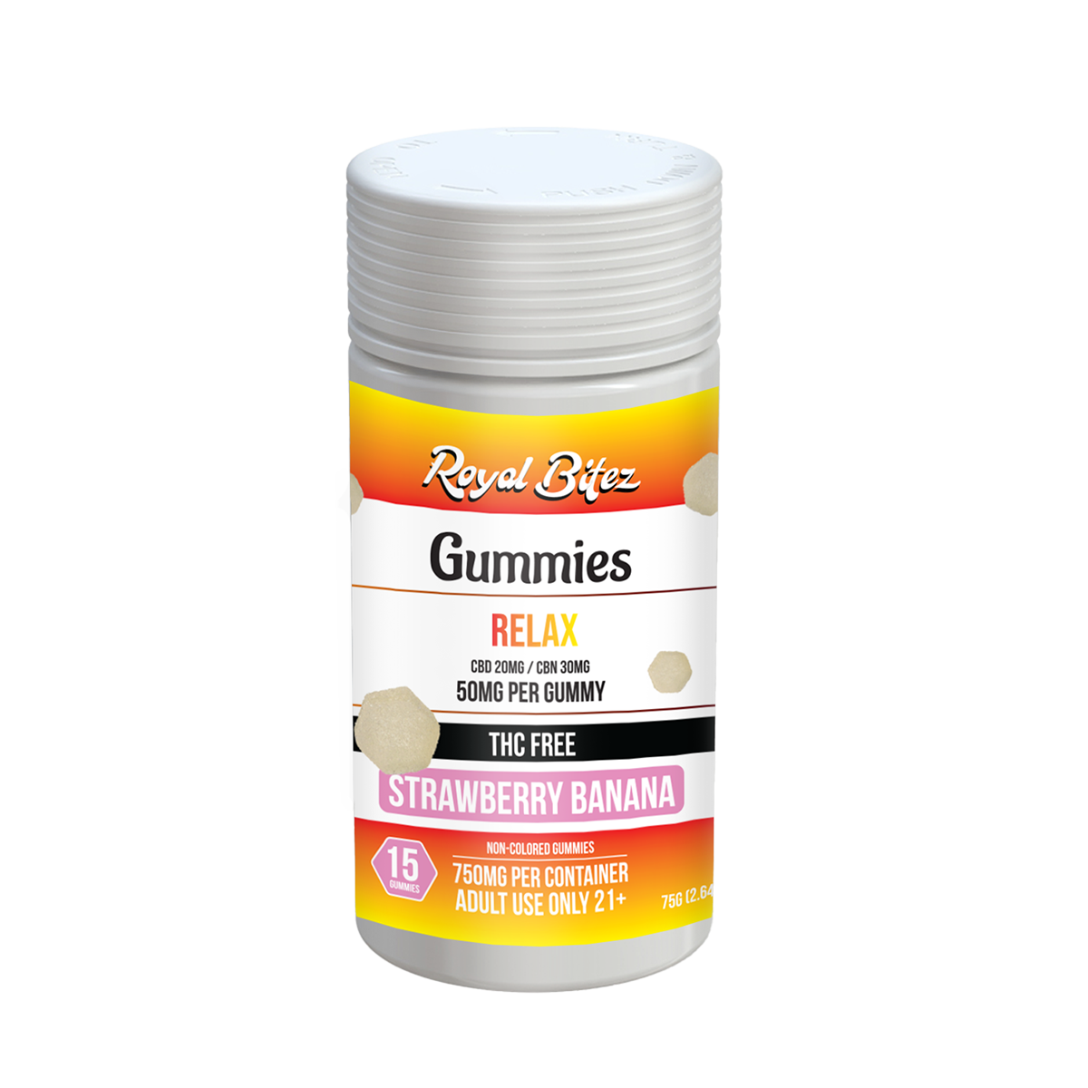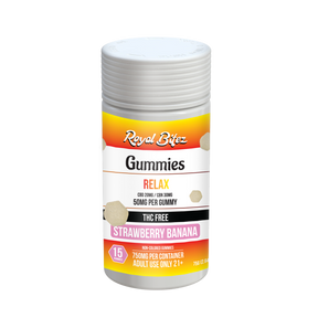 Royal Bitez Relax Strawberry Banana Gummies are formulated to support calm, relaxation, and unwinding anytime you need it. Each gummy features a soothing blend of broad spectrum CBD and CBN, paired with a sweet strawberry banana flavor for a smooth, enjoyable experience.