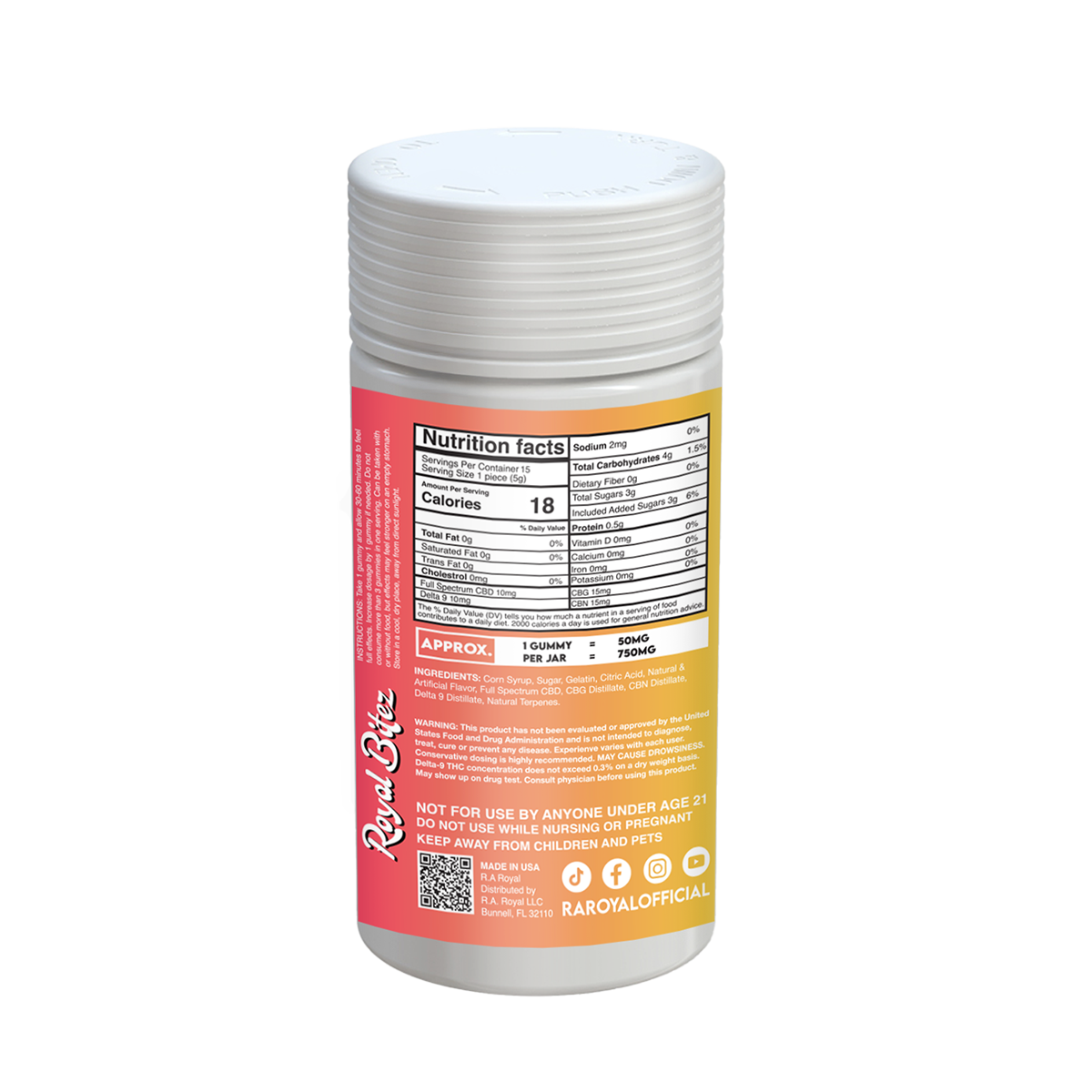 Royal Bitez Peach Delta-9 Gummies are crafted with a hybrid-specific cannabinoid blend designed for a balanced, versatile experience. Each gummy combines hemp-derived Delta-9 THC with full spectrum CBD, CBG, and CBN for smooth, all-day effects, finished with a sweet peach flavor.